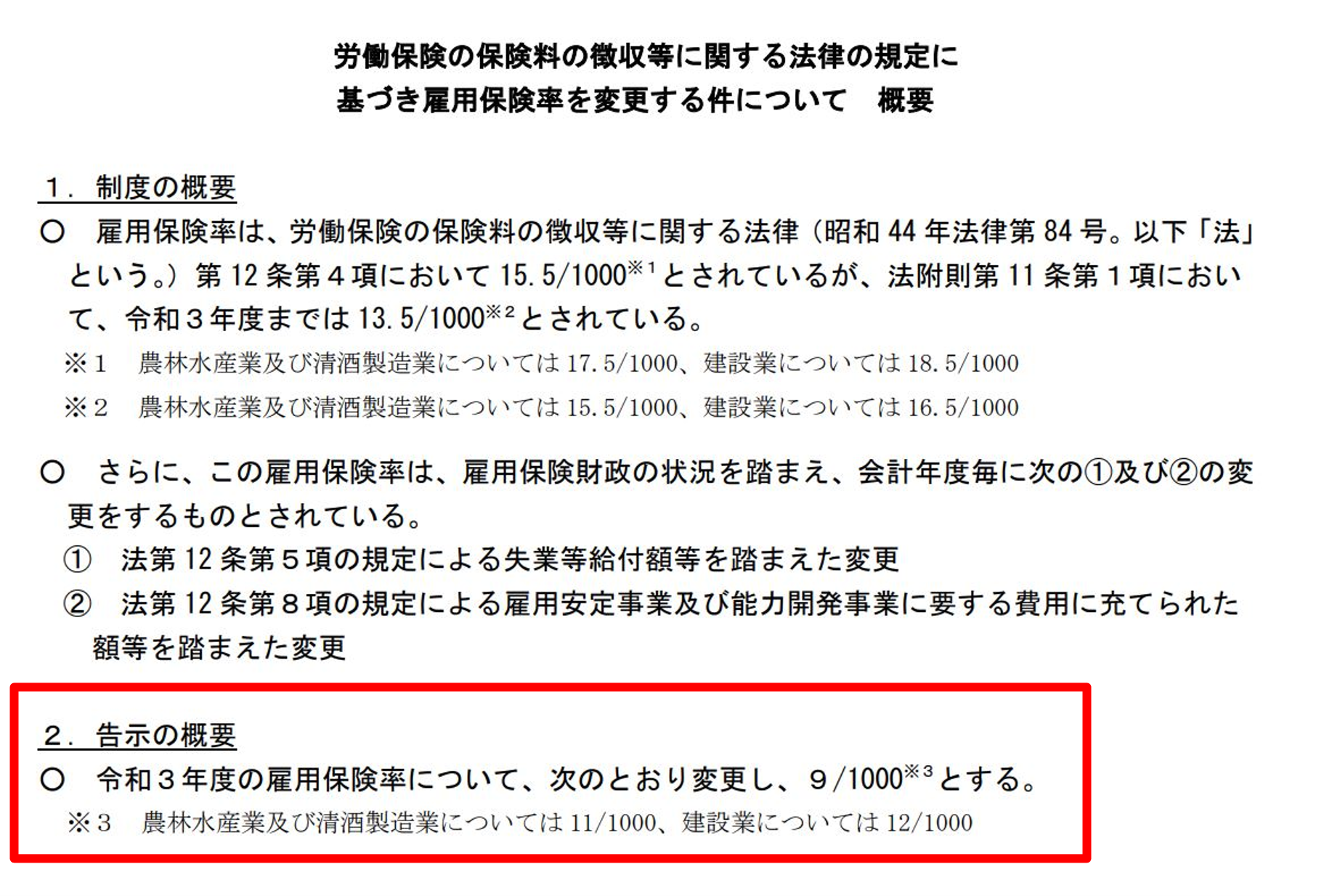 告示案によると、令和3年4月1日から令和4年3月31日までの雇用保険率を1000分の9(農林水産業及び清酒製造業については1000分の11、建設業については1000分の12)としています。