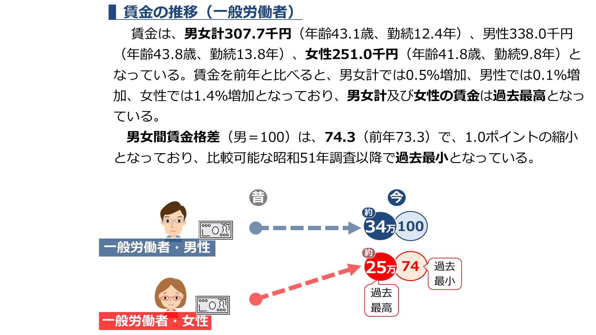 一般労働者(短時間労働者以外の労働者)の賃金について男女間賃金格差(男=100)をみると、【?】で、1.0ポイントの縮小となっており、比較可能な昭和51年調査以降で過去最小となっている。