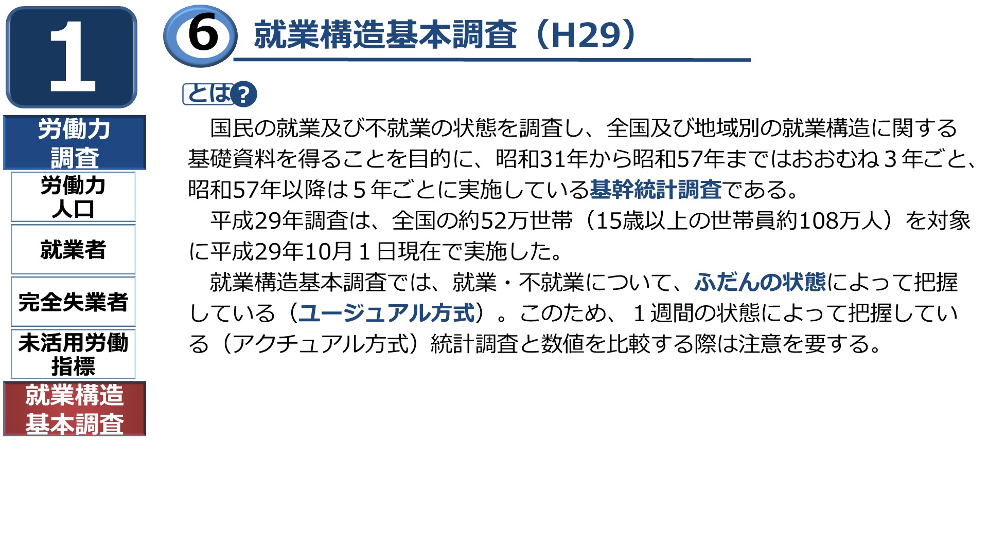 就業構造基本調査は、ユージュアル方式で、かつ、標本調査であるが、この文脈では「ユージュアル方式」が正解。