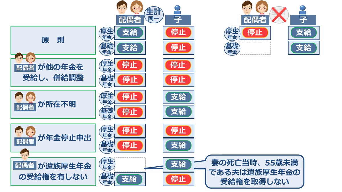 ・配偶者が年金停止の申出をした→子に対する遺族厚生年金は停止、遺族基礎年金は支給