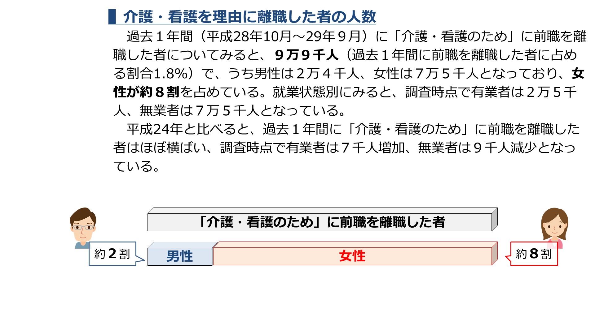 過去1年間(平成28年10月~29年9月)に「介護・看護のため」に前職を離職した者についてみると、9万9千人で、うち女性が約【?】割を占めている。