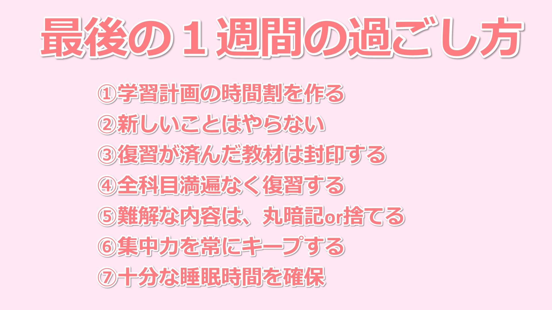 最後の1週間で、新しいことに着手して定着させる時間的余裕はありません。