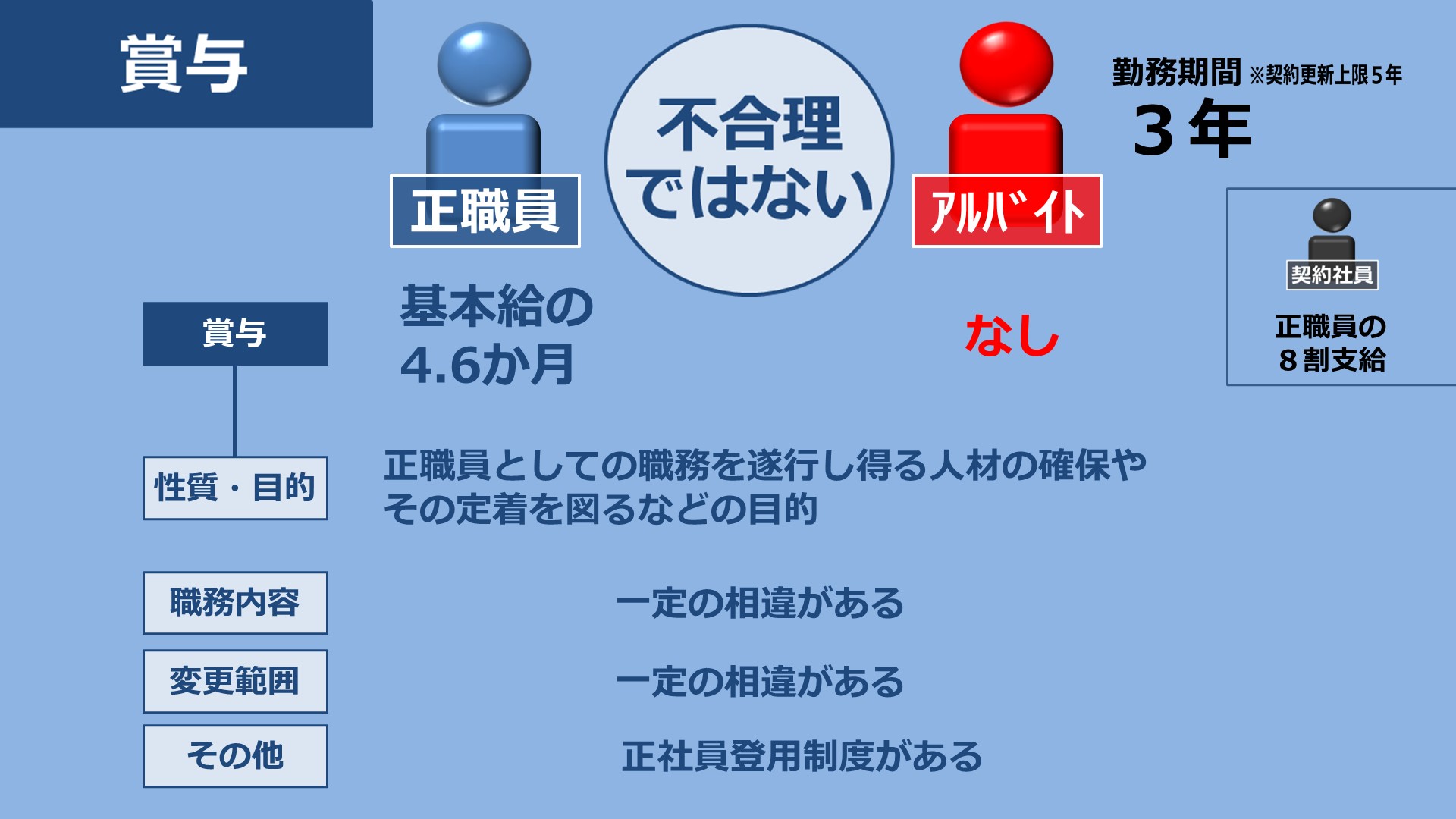 「この待遇はこういう目的のものだ。そして仕事の内容にはこういった差がある。したがって、この労働条件の相違は合理的だ」という考え方です。