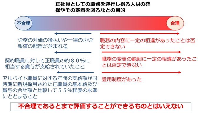 職務内容に違いさえあれば、どんな労働条件の相違も合法、という捉え方もできてしまうからです。