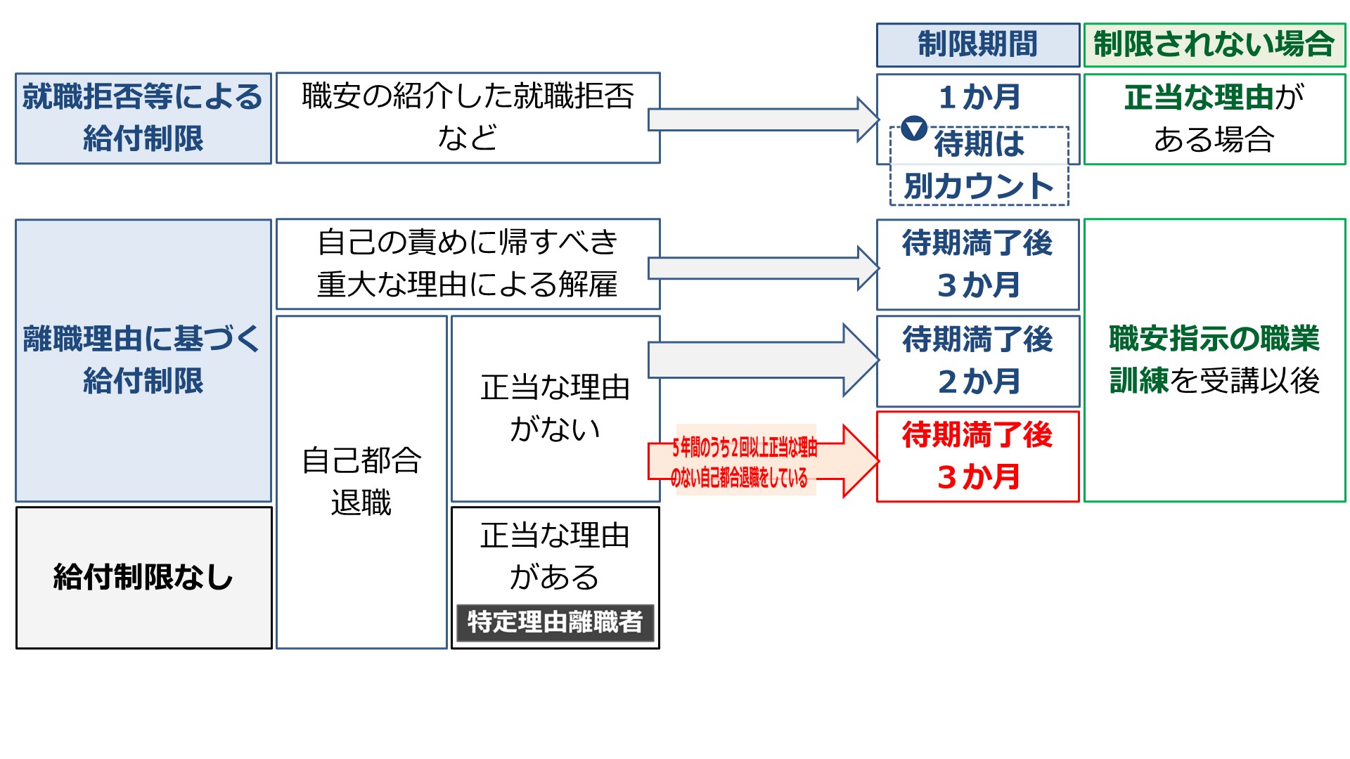令和2年10月1日以降に正当な理由なく自己の都合により退職した場合の給付制限期間は、2か月となる(ニに該当する場合は1か月とする。)。なお、当該退職した日から遡って5年間のうちに2回以上(離職日を基準とする)、正当な理由なく自己の都合により退職(令和2年10月1日以降のものに限る。)し求職申込みをした者については、当該退職にかかる給付制限期間は3か月となる。
