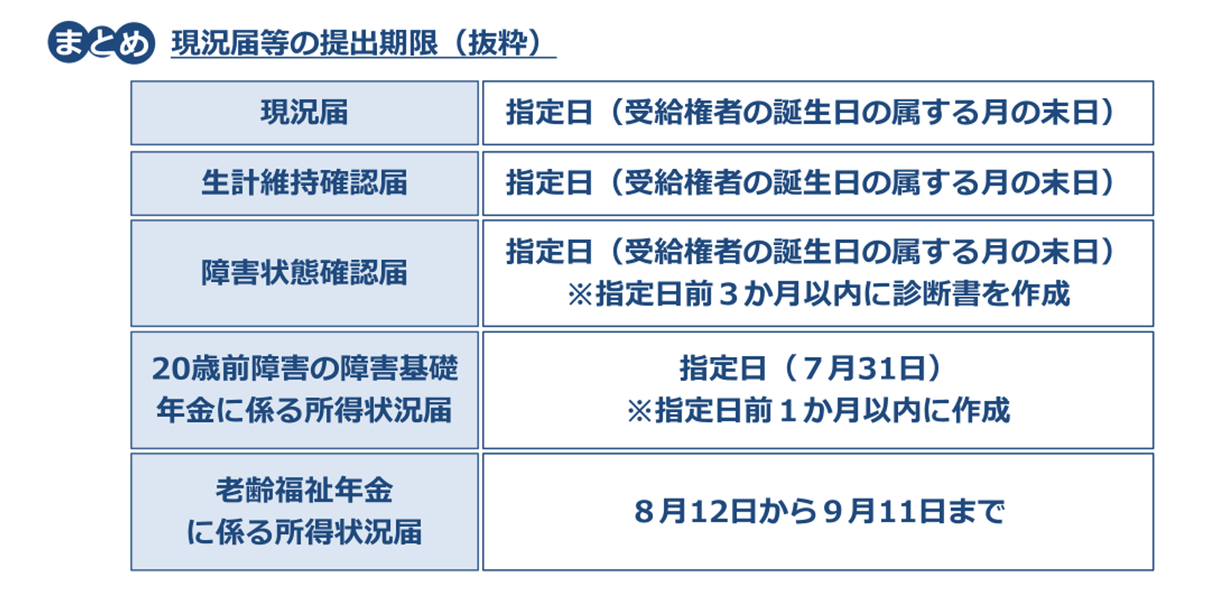 C 障害の程度の審査が必要であると認めて厚生労働大臣により指定された障害基礎年金の受給権者は、当該障害基礎年金の額の全部につき支給停止されていない限り、厚生労働大臣が指定した年において、指定日までに、指定日前1か月以内に作成されたその障害の現状に関する医師又は歯科医師の診断書を日本年金機構に提出しなければならない。