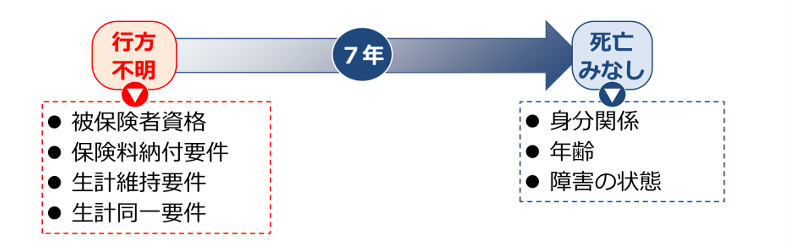 誤り。 死亡とみなされる日には、実際には死亡者との生計維持関係もなくなっていることから、被保険者資格、保険料納付要件、生計維持関係等に関しては、行方不明になった当時の時点で判定される。 【行方不明時点で死亡みなし】
