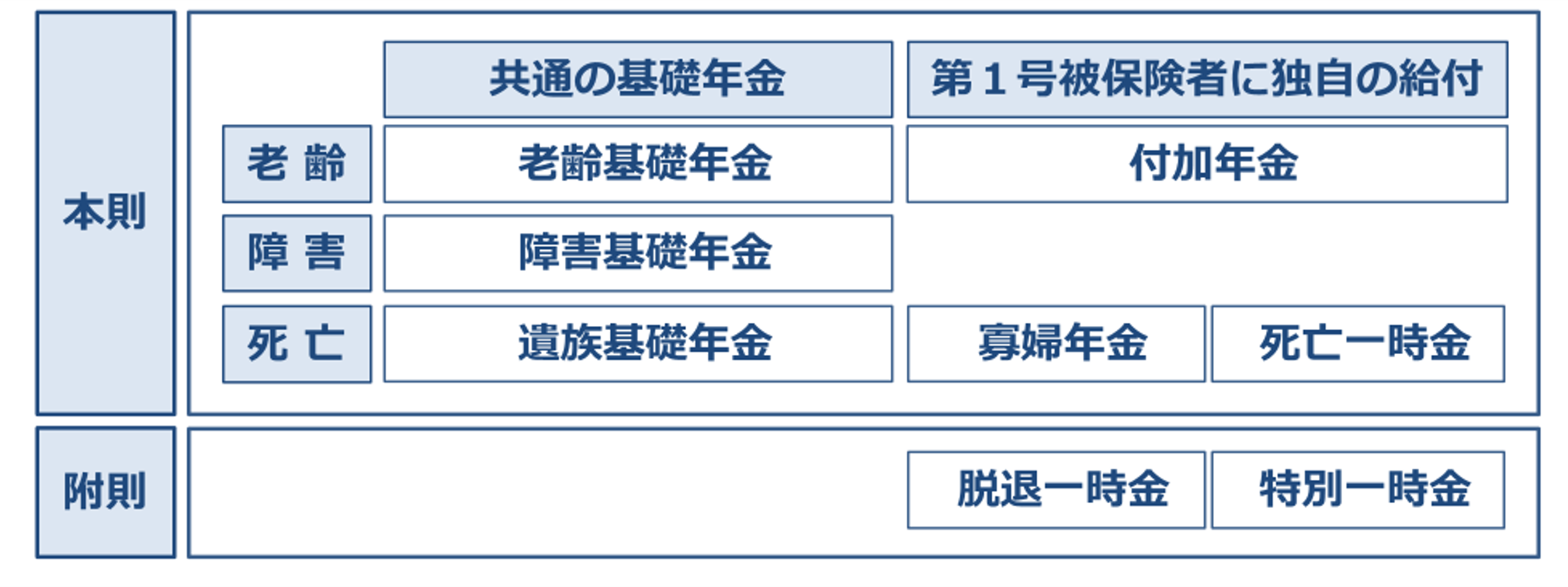 E 国民年金法によれば、給付の種類として、被保険者の種別のいかんを問わず、加入実績に基づき支給される老齢基礎年金、障害基礎年金及び遺族基礎年金と、第1号被保険者としての加入期間に基づき支給される付加年金、寡婦年金及び脱退一時金があり、そのほかに国民年金法附則上の給付として特別一時金及び死亡一時金がある。