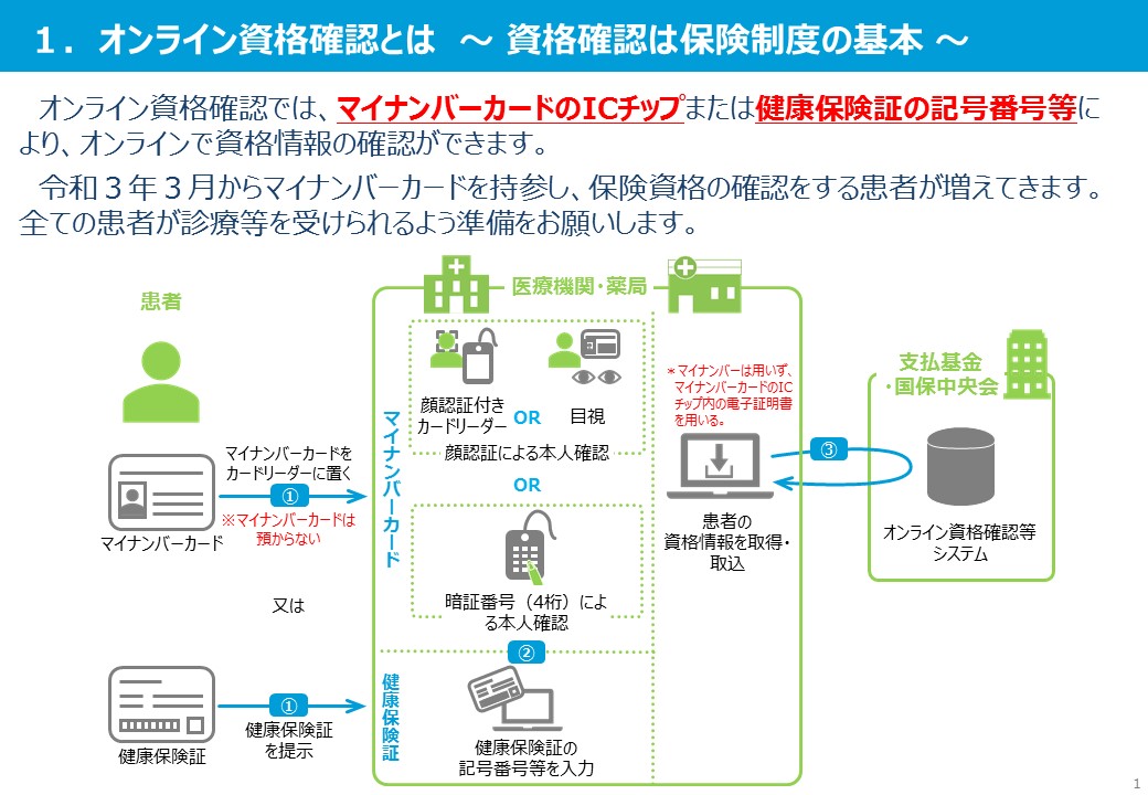 また、オンライン資格確認に当たっては、既存の健康保険証による資格確認に加えて、個人番号カード(マイナンバーカード)による資格確認を可能とする。