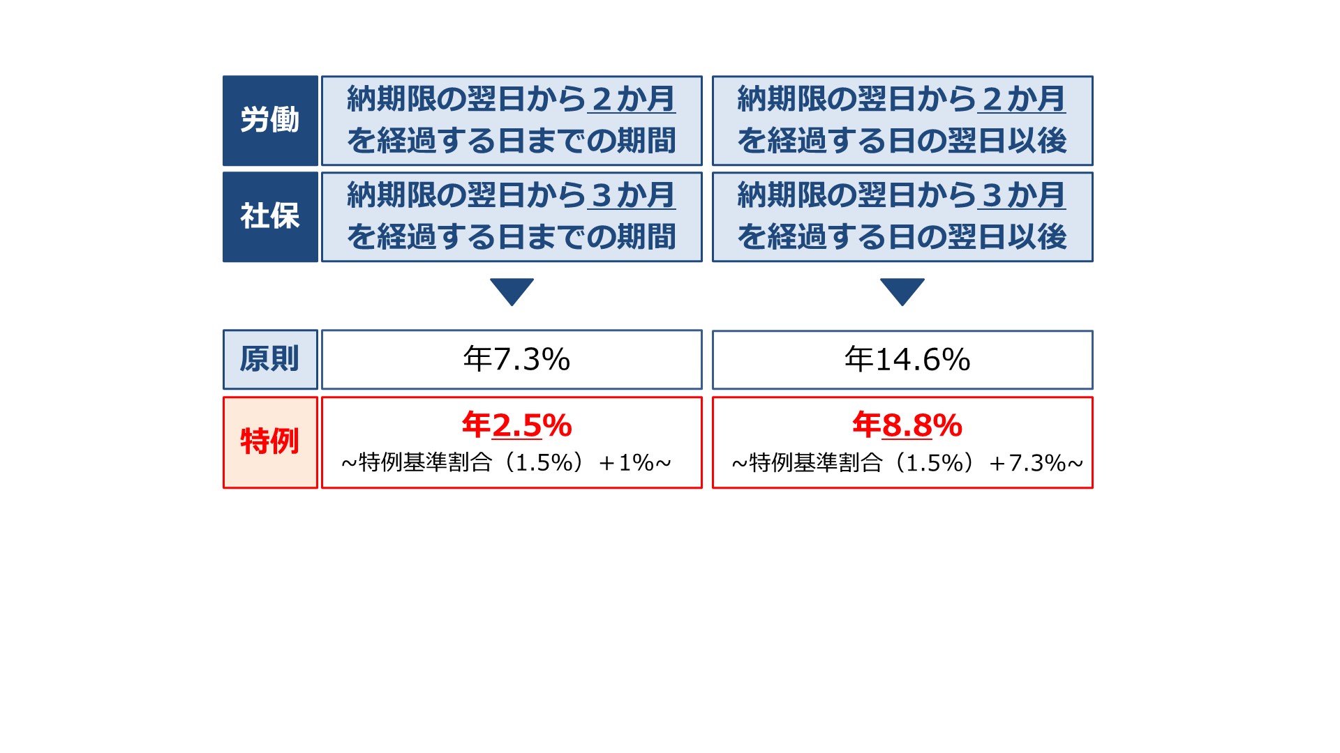 滞納した健康保険の保険料等に係る延滞金の割合について、当分の間、各年の租税特別措置法第94条第1項に規定する延滞税特例基準割合が年7.3%の割合に満たない場合には、その年中においては、年14.6%の割合については当該延滞税特例基準割合に年7.3%の割合を加算した割合とし、年7.3%の割合については、当該延滞税特例基準割合に年1%の割合を加算した割合(当該加算した割合が年7.3%の割合を超える場合には、年7.3%の割合)とすることとされている。