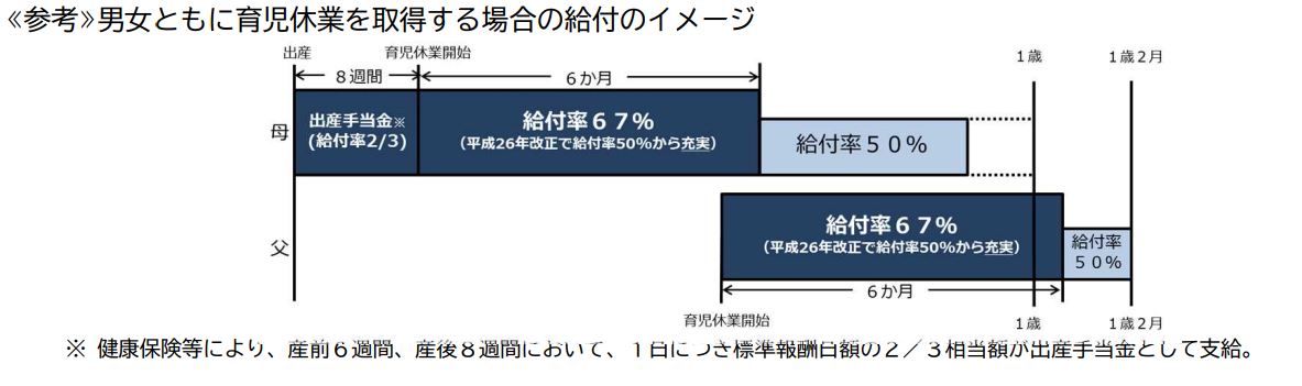 - 給付率やその他の制度設計については、現行の育児休業給付金と同等とし、また、67%の給付率が適用される期間(6か月間)の取扱いについては、新給付金と育児休業給付金の期間を通算する