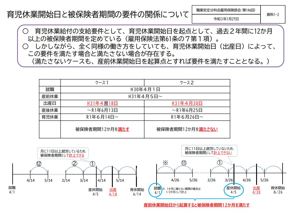 また、育児休業給付の支給の前提となる、休業前2年間に12か月以上の被保険者期間要件について、対象者の出産日によって不合理な取扱いが生ずることのないよう、以下(4)のような見直しを行うことが必要である。