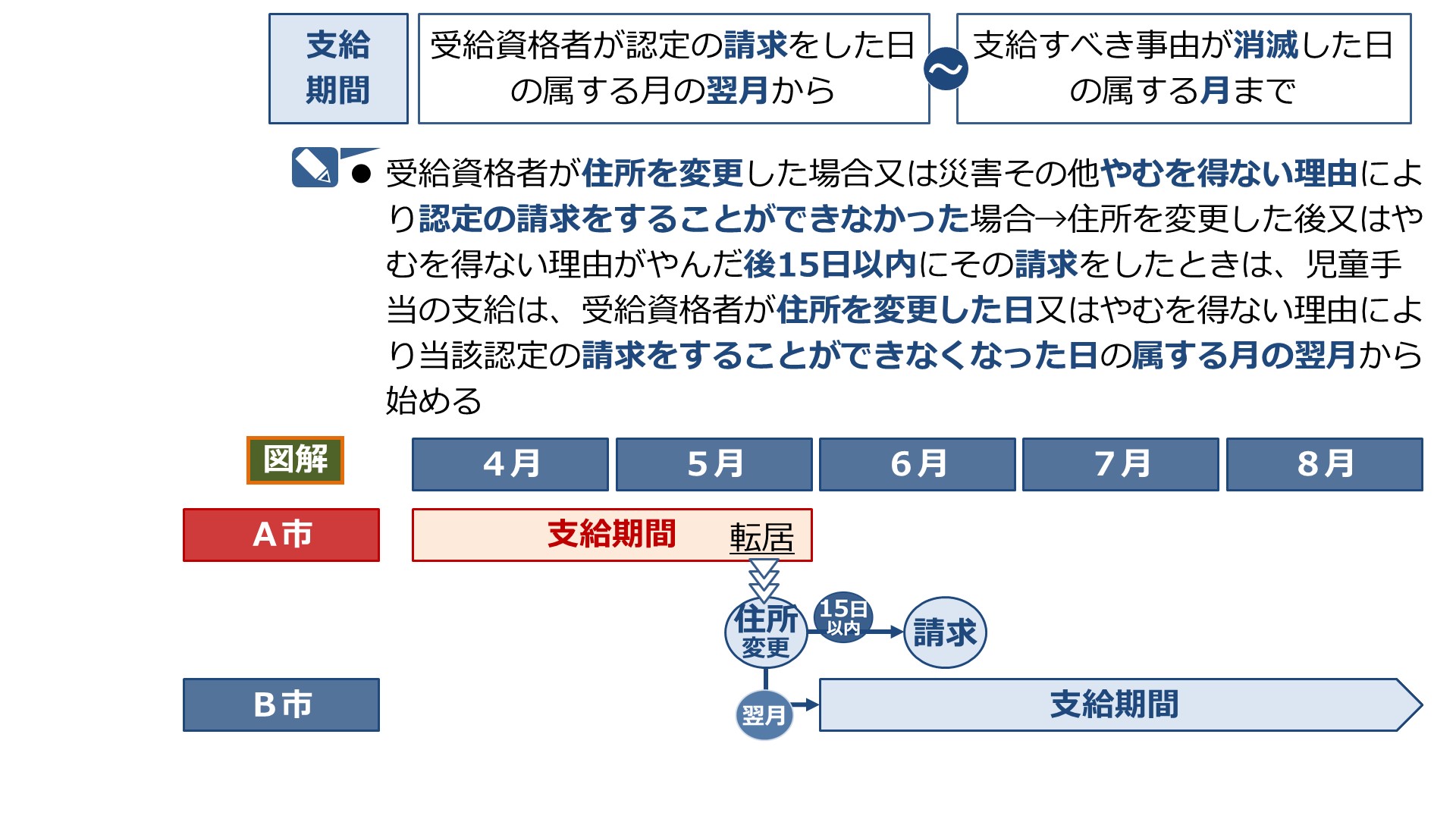 住所変更から15日以内に請求をした場合は、住所変更した月の翌月から支給を行う。