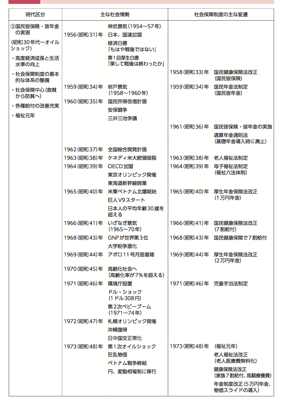 オイルショック前の昭和40年代は大幅な給付拡充が行われ、老人医療費無料制度、物価スライド制、高額療養費、児童手当制度等が相次いで制度化された。