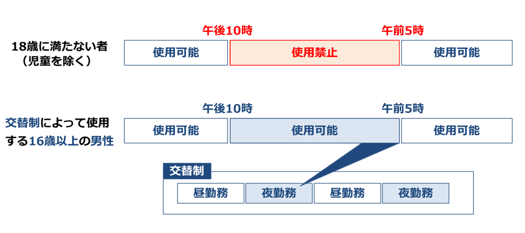 使用者は、満18才に満たない者を午後10時から午前5時までの間において使用してはならない。ただし、交替制によって使用する【?】については、この限りでない。