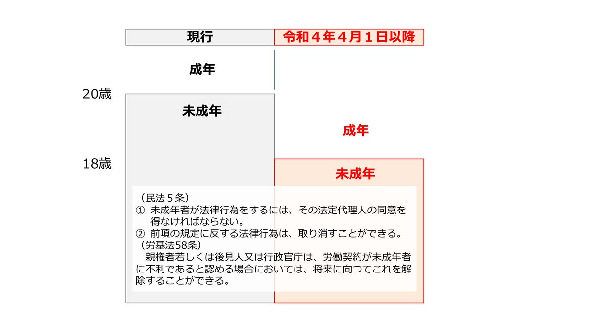 民法改正により、令和4年4月1日から、成年年齢が20歳以上から18歳以上に引き下げられる。