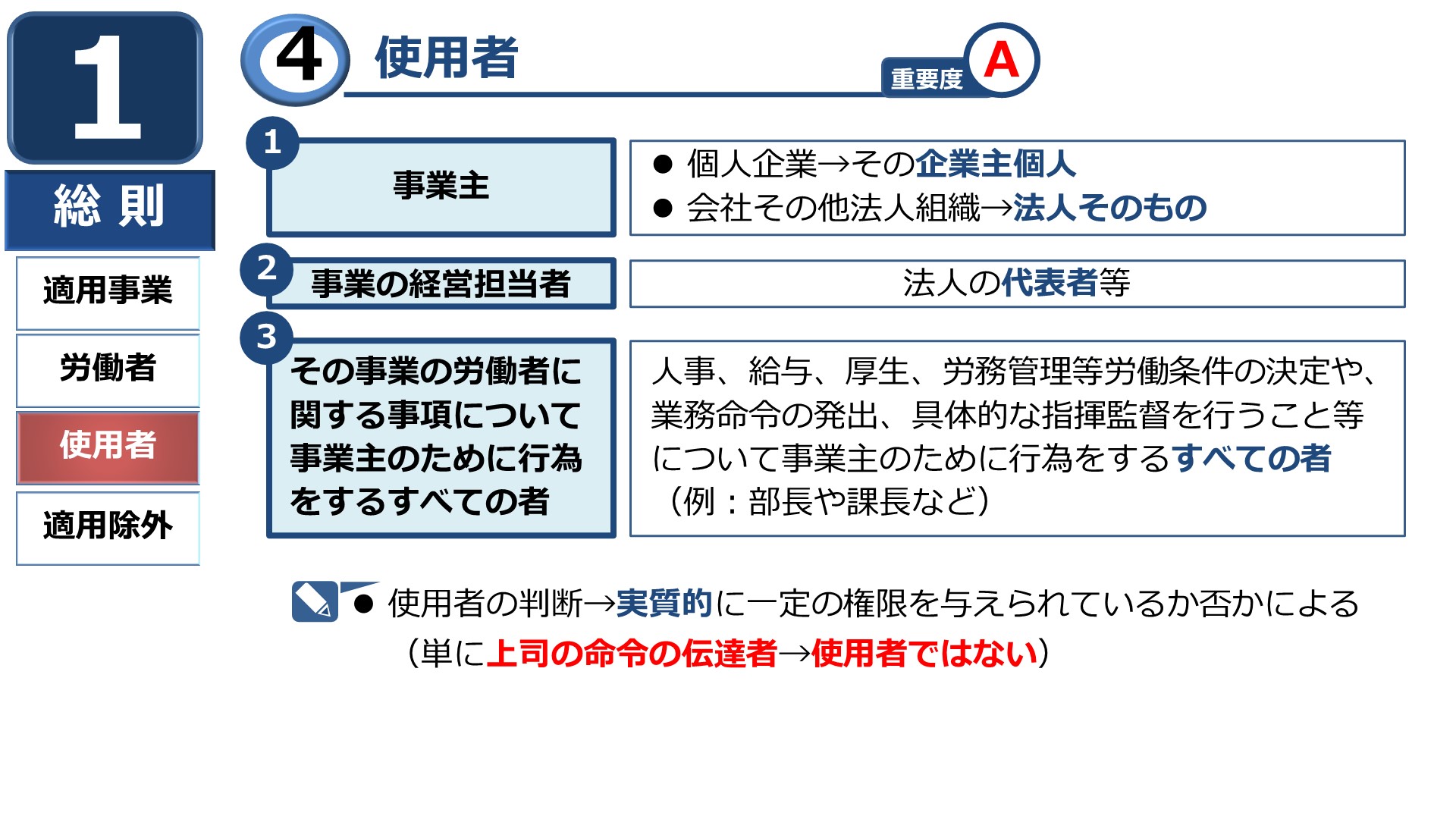 ③想起→「使用者のうちの”事業主”の定義」を想起します。「経営主体で、個人企業では企業主個人、株式会社の場合は法人そのもの」です。この際、テキスト上の使用者の定義の表がなんとなくイメージできていると最高です。