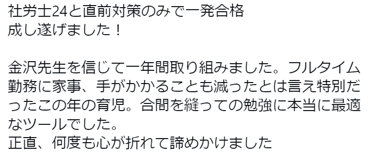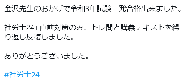 そこで、一つ、社労士24を活用し、初学者で一発合格された方の合格体験記やYou Tube動画、Twitterをご紹介します。
