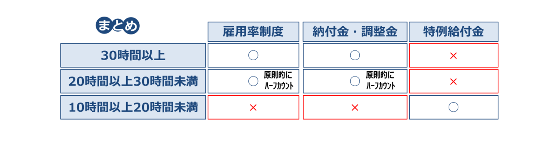 ・週20時間以上30時間未満→雇用率制度、納付金・調整金制度の対象(原則ハーフカウント)