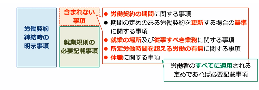 労働契約締結の際の明示事項と、就業規則の必要記載事項を比べると、前者の方が範囲は広い。