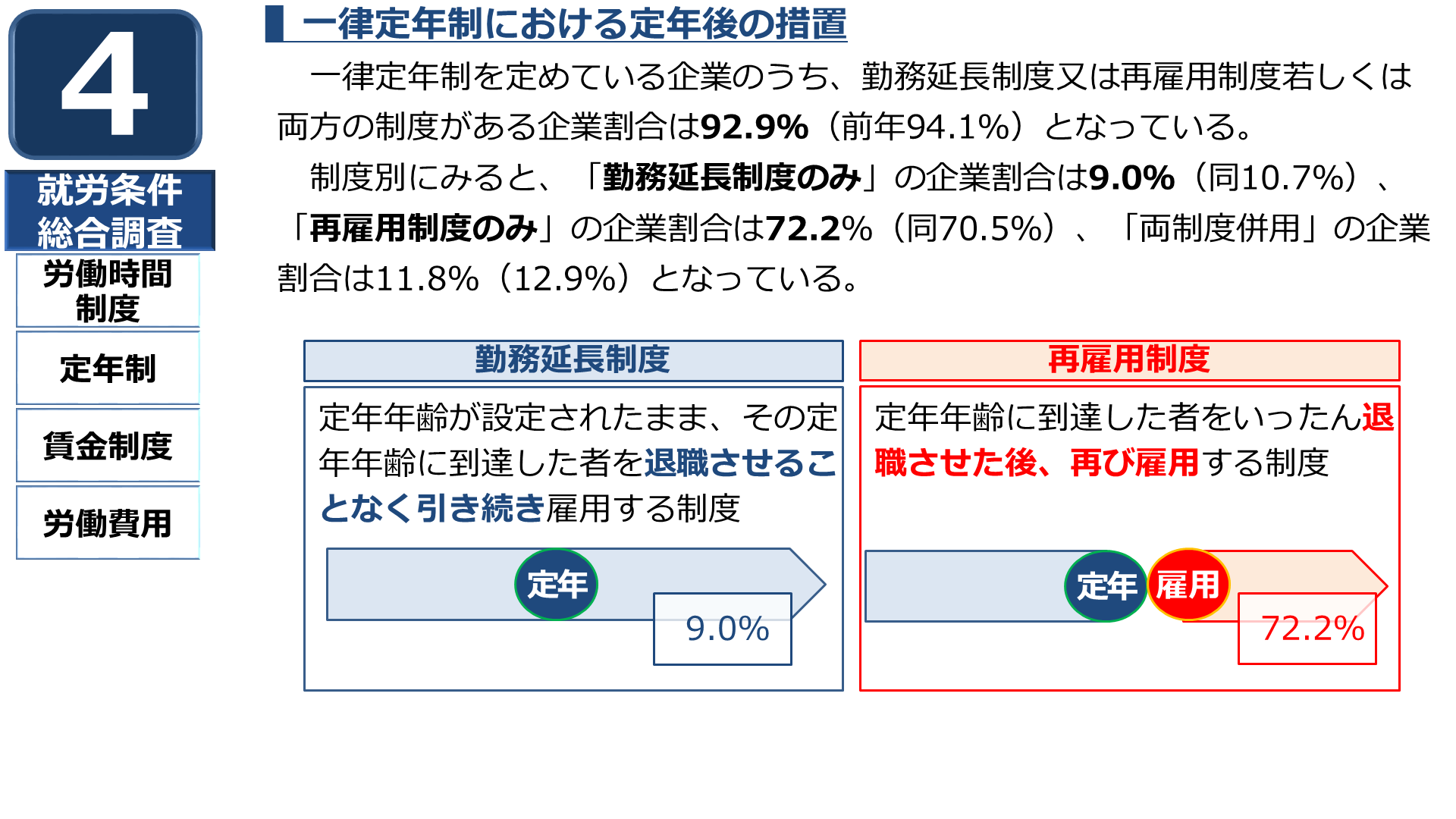 平成29年就労条件総合調査によると、一律定年制を定めている企業のうち、勤務延長制度又は再雇用制度若しくは両方の制度がある企業割合は92.9%となっている。 制度別にみると、「【?】」の企業割合は72.2%となっている。