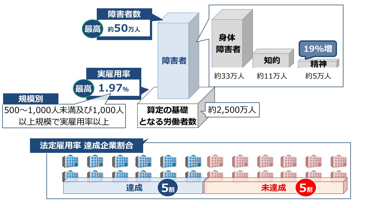 「障害者の雇用の促進等に関する法律」では、事業主に対して、その雇用する労働者に占める障害者の割合が一定率(法定雇用率)以上になるよう義務づけている。