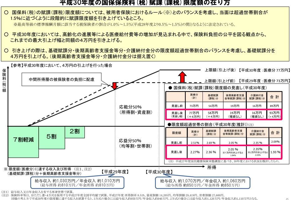 国民健康保険・後期高齢者医療の保険料(税)の賦課(課税)限度額について、国民健康保険は89万円から93万円に、後期高齢者医療は57万円から62万円に、それぞれ引き上げる(平成30年度分の保険料(税)から実施)。