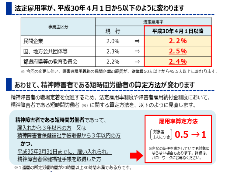 平成30年4月1日から、障害者雇用義務の対象として、これまでの身体障害者、知的障害者に精神障害者が加わり、あわせて法定雇用率も次のように変わる。