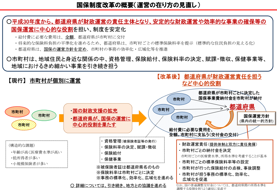 「都道府県も市区町村とともに保険者に」 都道府県の役割は「市町村から財布を預かって」上手に管理すること。これは制度発足以来の大改革。 一方、加入者からすると窓口は今まで通り最寄りの市役所なので、大きな変更はない。しかし、次の点は加入者にとってのメリットになる。