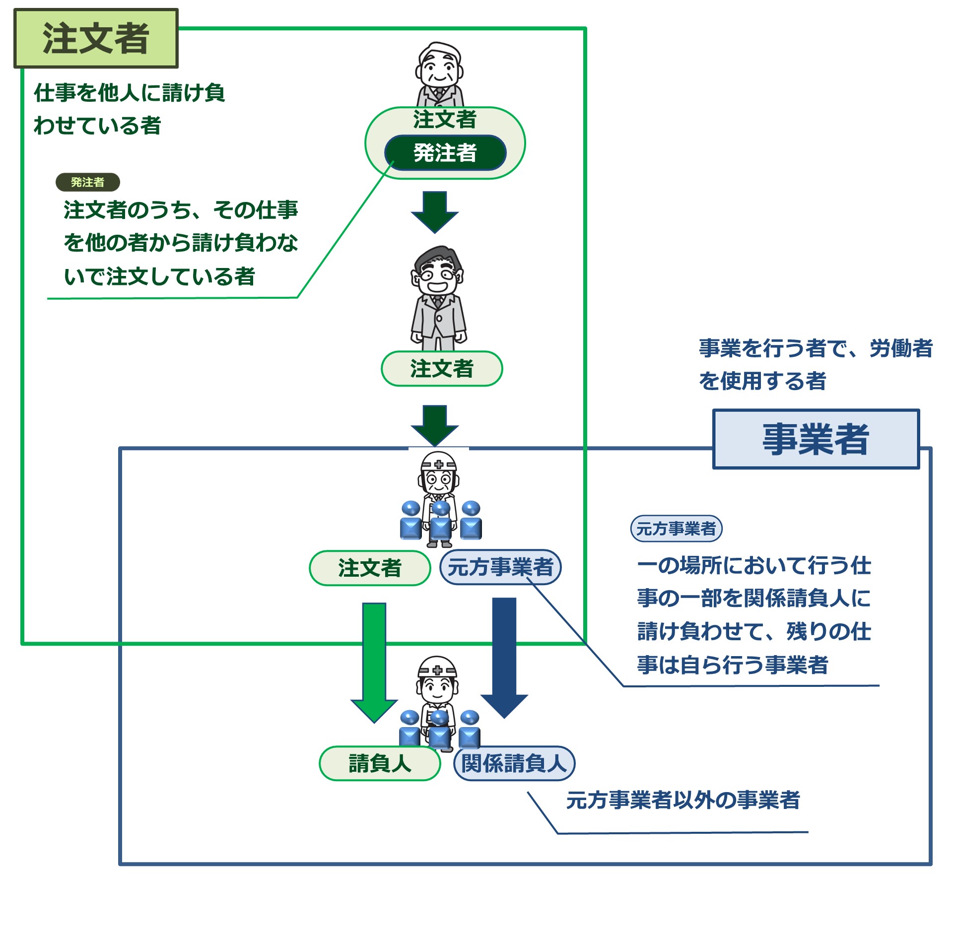 一方、「注文者」のうち、労働者を使用して自らも仕事をする者を「元方事業者」といい、「注文者」としての義務に加え、下請や下請の労働者に対する指導・指示の義務などがある。