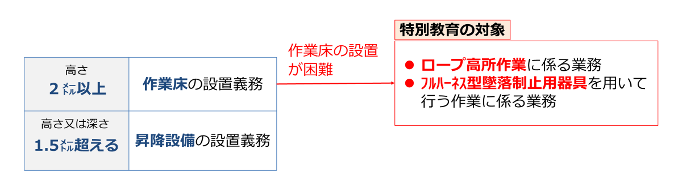 ・2㍍以上(作業床の設置が困難)→ロープ高所作業やフルハーネス型墜落制止用器具を用いる作業に係る特別