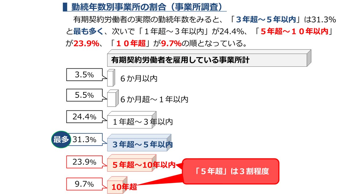 いわゆる労働契約法の「無期転換申込権」を巡る話題で「勤続年数5年超の労働者割合が約3割」というデータがよく添えられますが、本調査がその資料になっています。