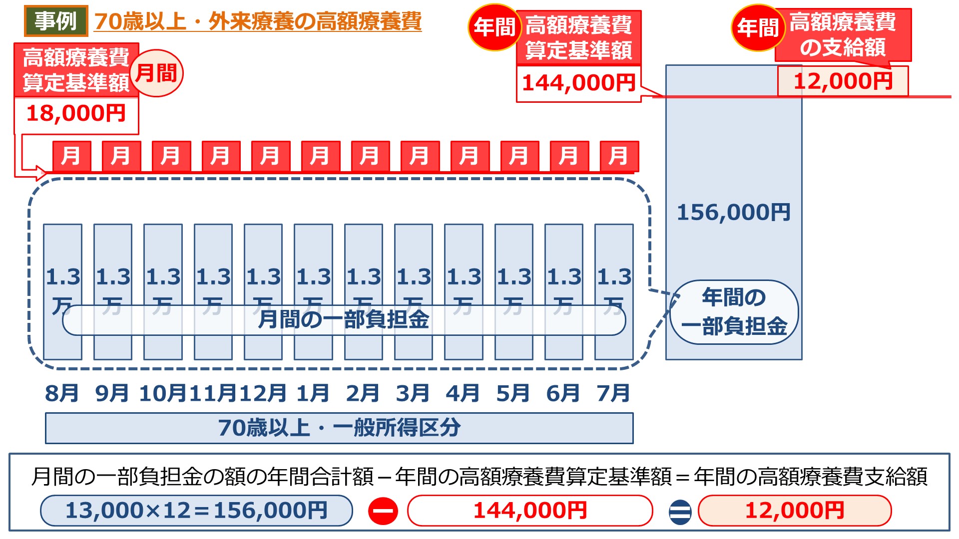 結果、その超える金額の12,000円(156,000円-144,000円)が外来療養(年間)の高額療養費の支給額になる。