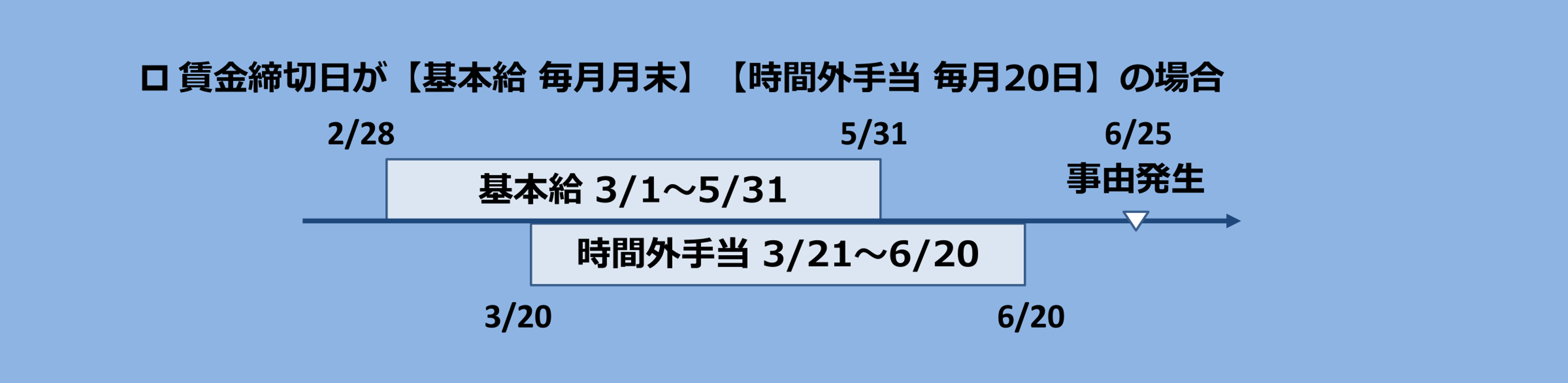 - 賃金締切日が、基本給は毎月月末、時間外手当は毎月20日とされている事業場において、例えば6月25日に算定事由が発生したときは、(賃金毎に賃金締切日が異なる場合、直前の賃金締切日は、それぞれ各賃金ごとの賃金締切日とされているので)、平均賃金の起算に用いる直前の賃金締切日は、【基本給は5月31日】、【時間外手当は6月20日】とし、この日から遡った3か月が平均賃金の算定期間となる。