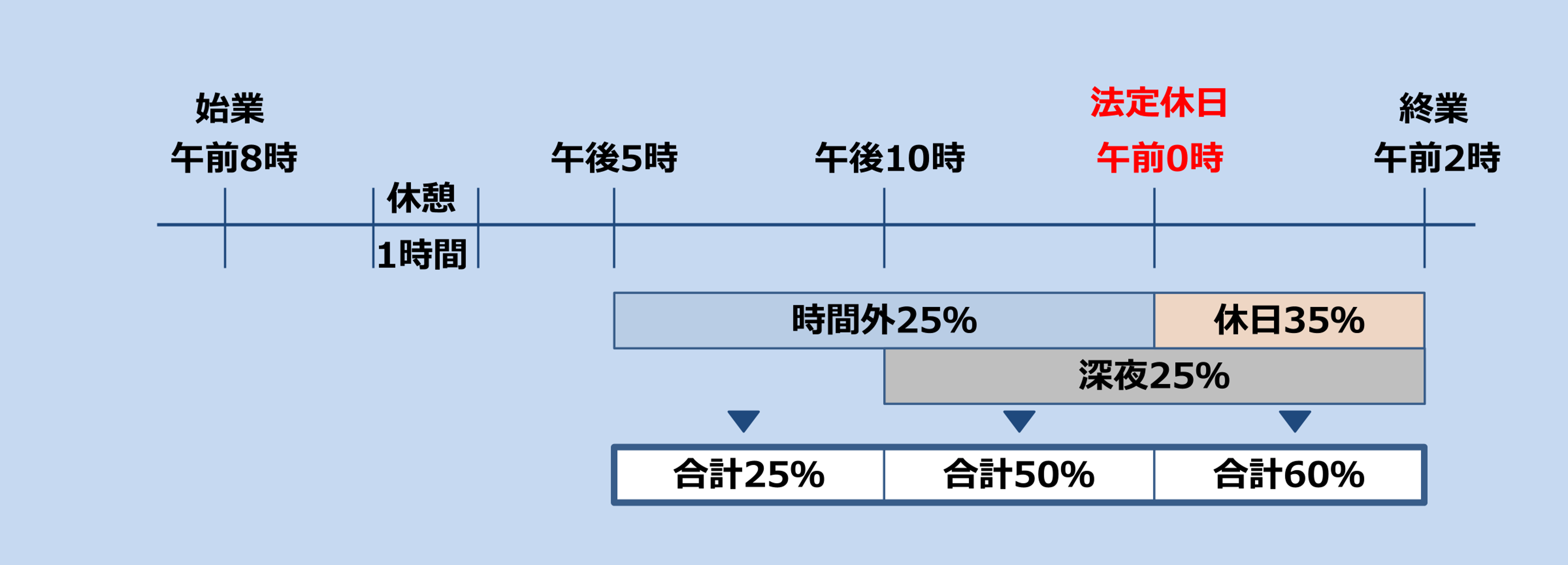 - 始業時刻が午前8時、終業時刻が午後5時、休憩時間が正午から午後1時までの事業場において、残業を行い、翌日の法定休日の午前2時まで勤務したとき、午後5時から午後10時までは通常の労働時間又は労働日の賃金の計算額の2割5分以上(時間外25%)の割増賃金、午後10時から翌日の午前0時までは5割以上(時間外25%+深夜25%)の割増賃金、翌日の午前0時から午前2時までは6割以上(休日35%+深夜25%)の割増賃金を支払わなければならない。