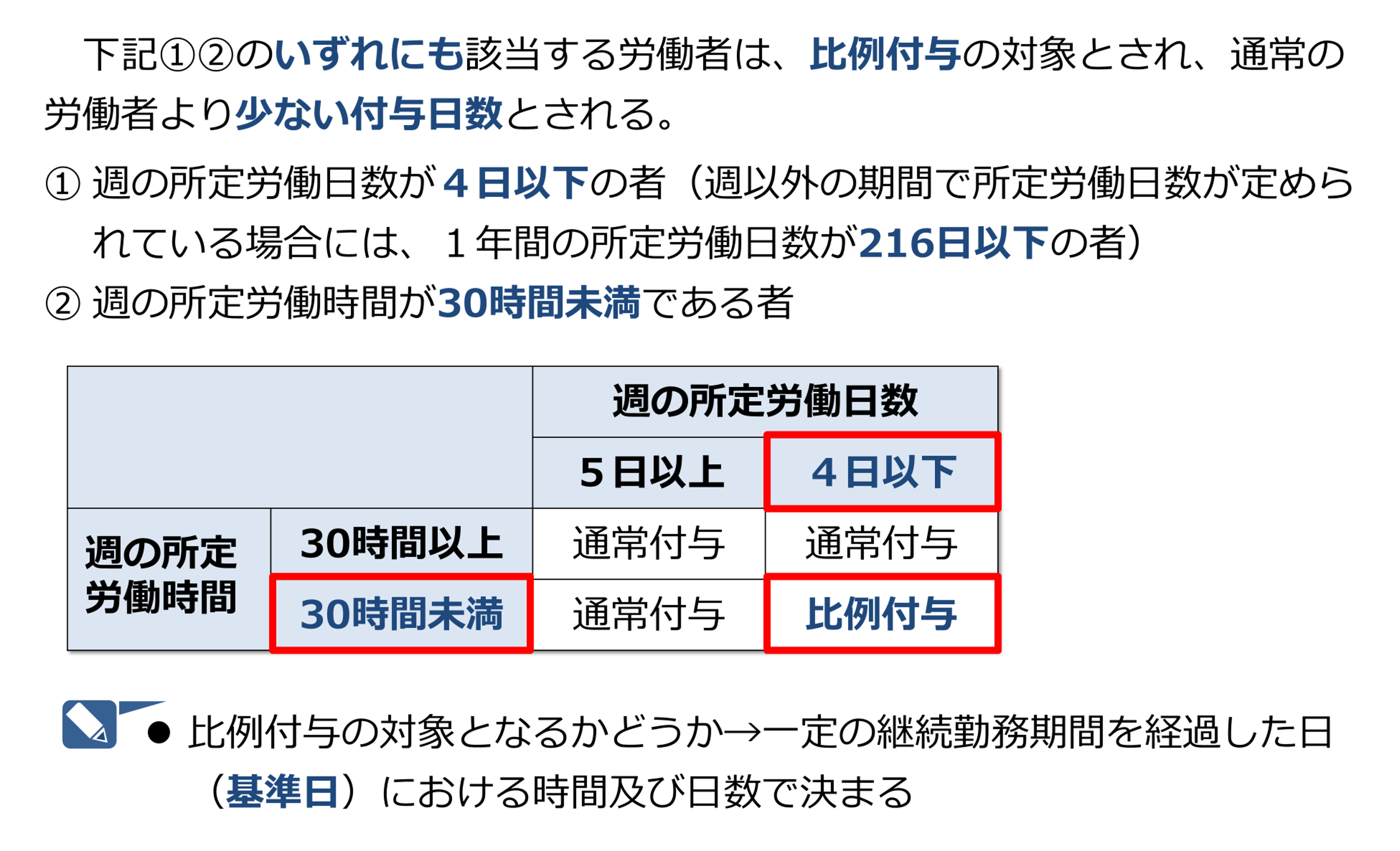 - 使用者は、その事業場に、同時に採用され、6か月間継続勤務し、労働基準法第39条所定の要件を満たした週の所定労働時間20時間(勤務形態は1日4時間、週5日勤務)の労働者と週の所定労働時間30時間(勤務形態は1日10時間、週3日勤務)の労働者の2人の労働者がいる場合、両者とも通常付与の対象となるため、両者には同じ日数の年次有給休暇を付与しなければならない。