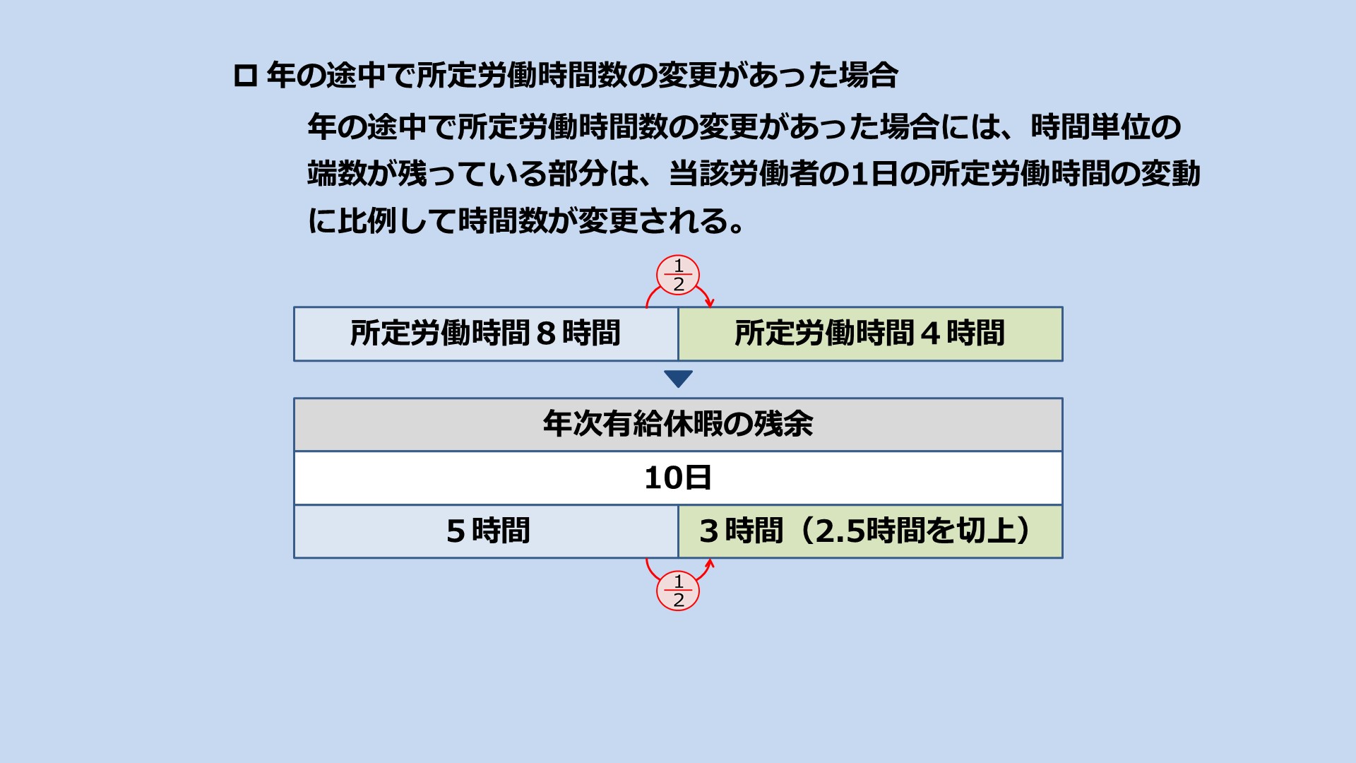 - 所定労働時間が年の途中で1日8時間から4時間に変更になった。この時、変更前に年次有給休暇の残余が10日と5時間の労働者であった場合、当該労働者が変更後に取得できる年次有給休暇について、日数の10日は変更にならないが、時間数の方は5時間から3時間(2.5時間を切り上げて3時間)に変更される。(年の途中で所定労働時間数の変更があった場合には、時間単位の端数が残っている部分は、当該労働者の1日の所定労働時間の変動に比例して時間数が変更されることになるため。)