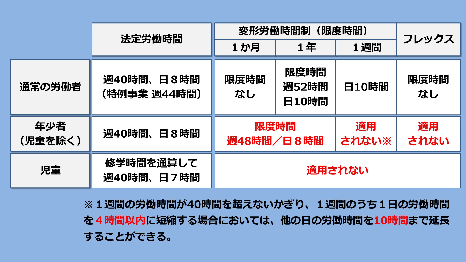 - 18歳に満たない者については、いわゆる変形労働時間制は適用されないが、労働基準法第60条第3項の規定により、満15歳以上で満18歳に満たない者については、満18歳に達するまでの間(満15歳に達した日以後の最初の3月31日までの間を除く。)、1週間について48時間、1日8時間(10時間×)を超えない範囲内において、労働基準法第32条の2の規定の例により労働させることができる。
