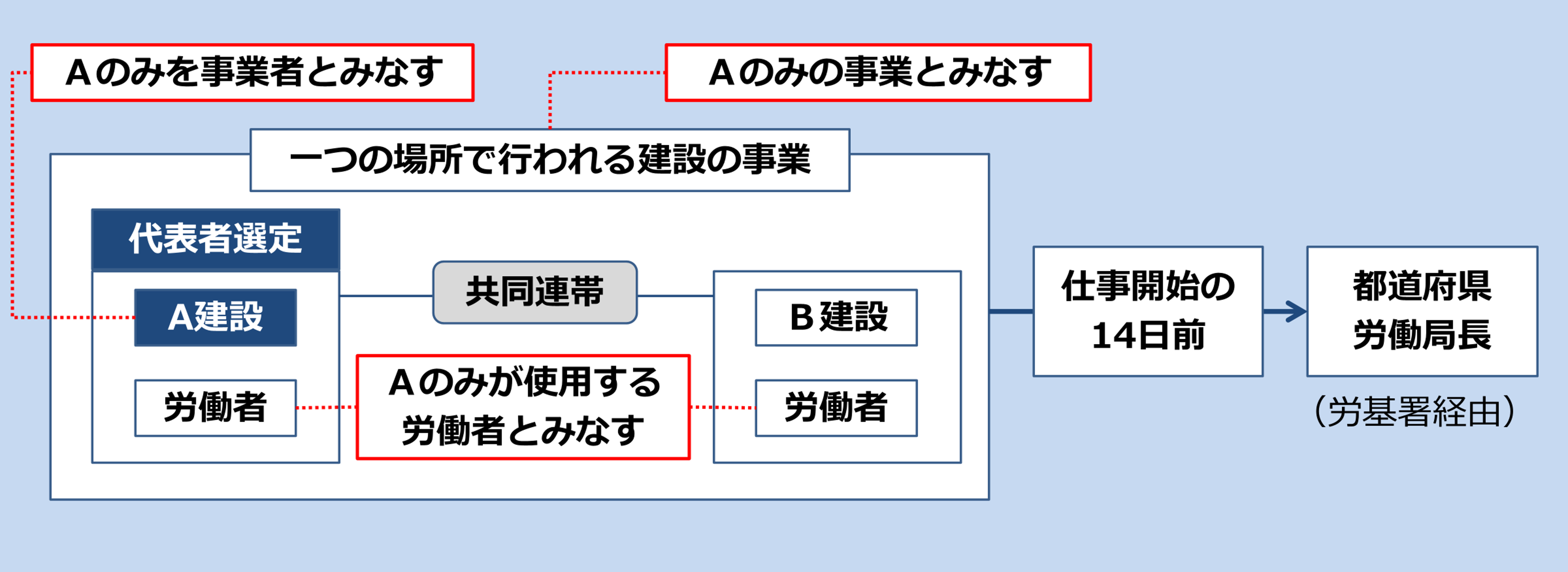 • 共同企業体代表届の届出をした場合においては、当該事業をその代表者のみの事業と、当該代表者のみを当該事業の事業者と、当該事業の仕事に従事する労働者(下請負人の労働者は含めない)を当該代表者のみが使用する労働者とそれぞれみなして、この法律を適用する。