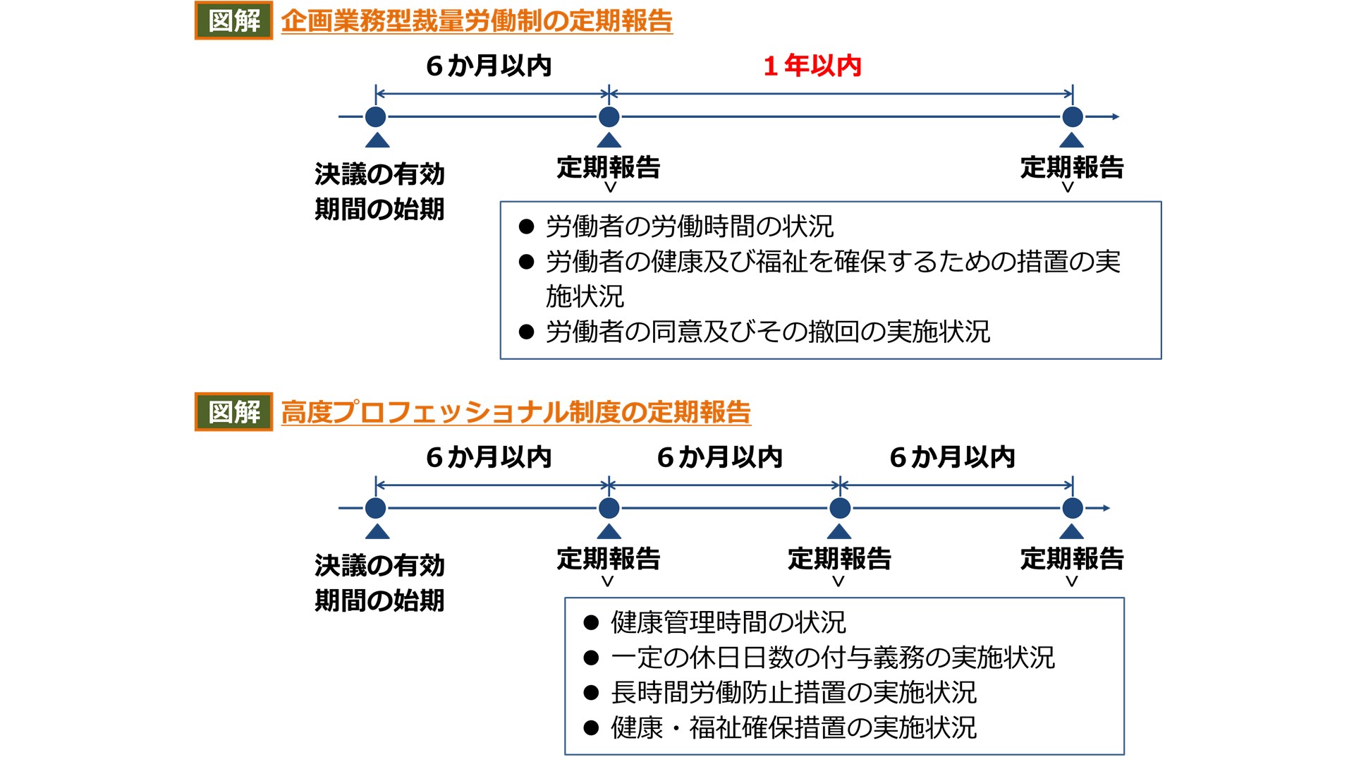 企画業務型裁量労働制を導入している事業場において、使用者は、決議の有効期間の始期から起算して【6か月以内に1回及びその後1年】以内ごとに1回、所轄労働基準監督署長に報告を行う。