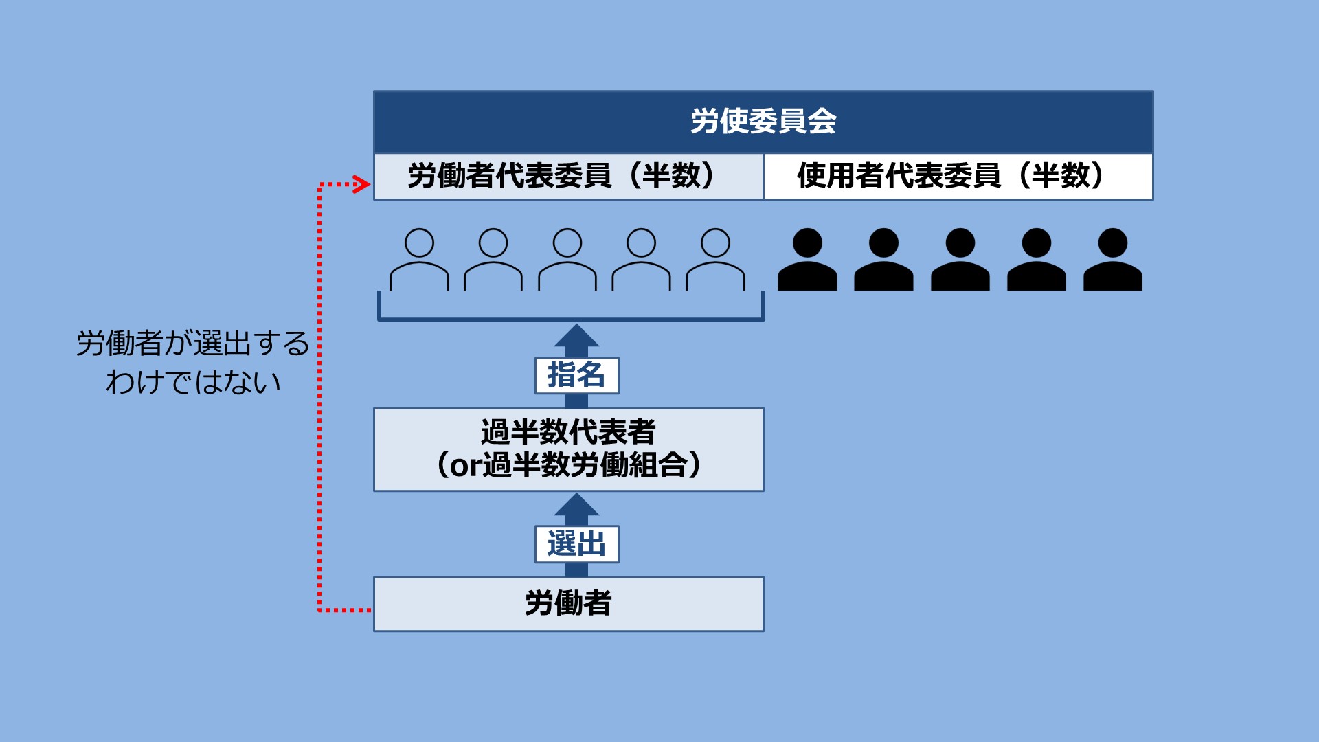 - 労使委員会の労働者側委員は、当該事業場に、労働者の過半数で組織する労働組合がある場合においてはその労働組合、労働者の過半数で組織する労働組合がない場合においては労働者の過半数を代表する者に任期を定めて指名される(事業場の労働者の投票又は挙手によって直接選出されるわけではない。)。
