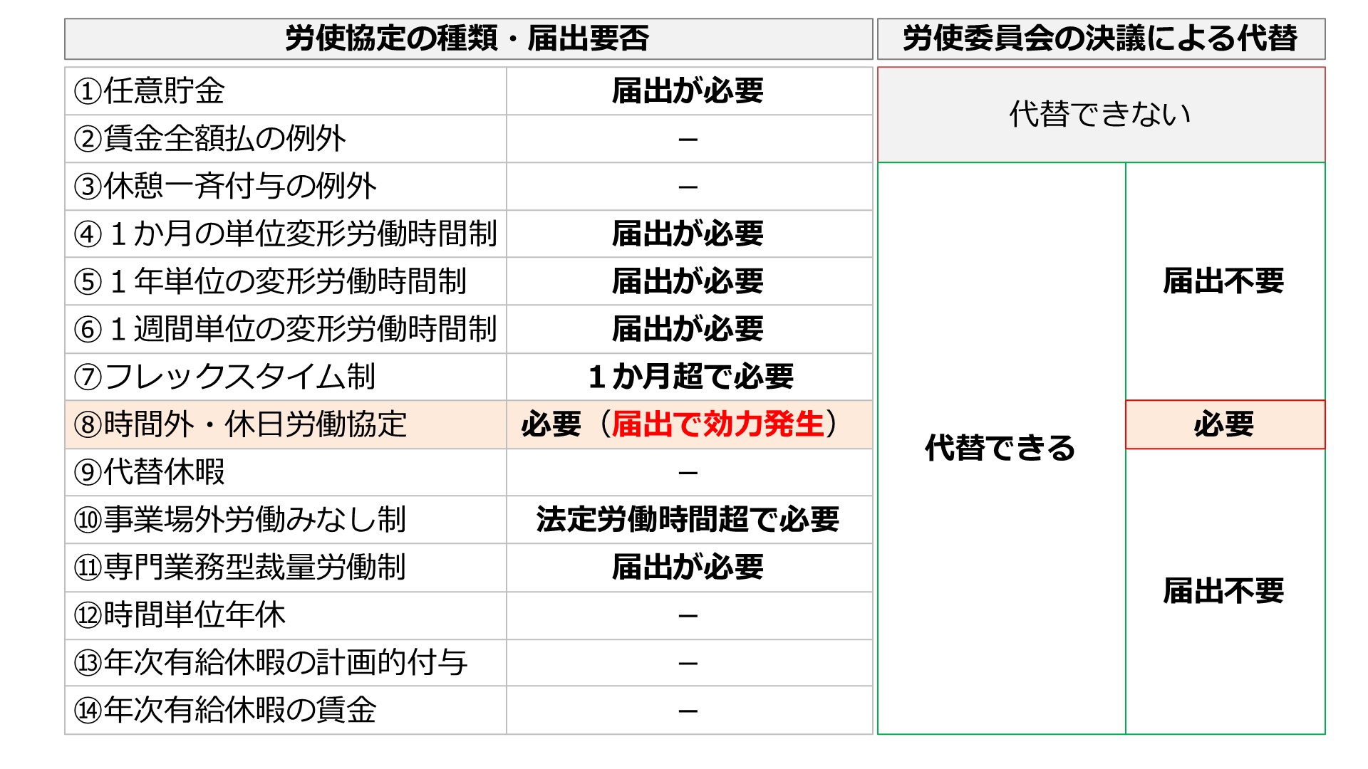 - 労使委員会は、企画業務型裁量労働制の実施に関する決議のほか、労働時間・休憩及び年次有給休暇に関する労働基準法上の労使協定に代替する決議を行うことができる。