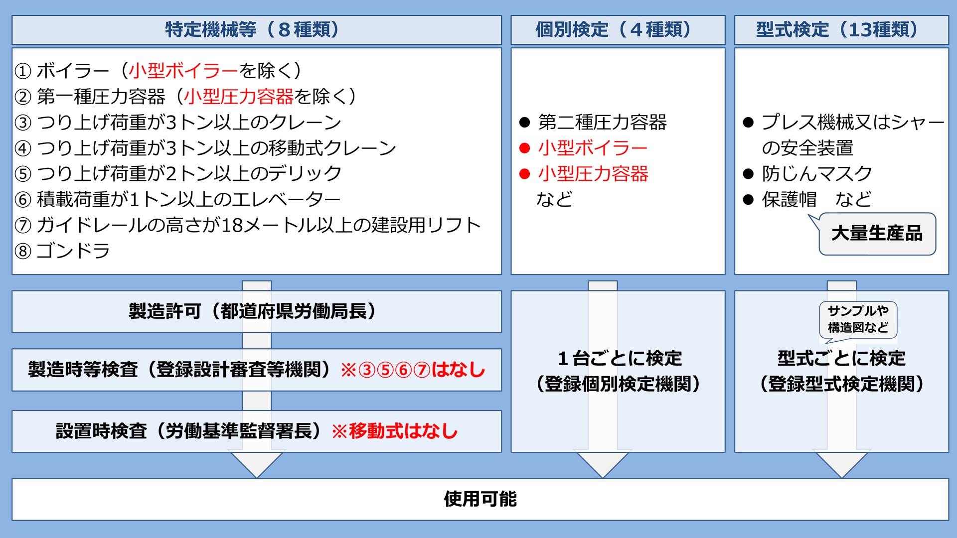 ・個別検定(4種類)→1台ごとに個別に検定。小型ボイラーや第二種圧力容器など
