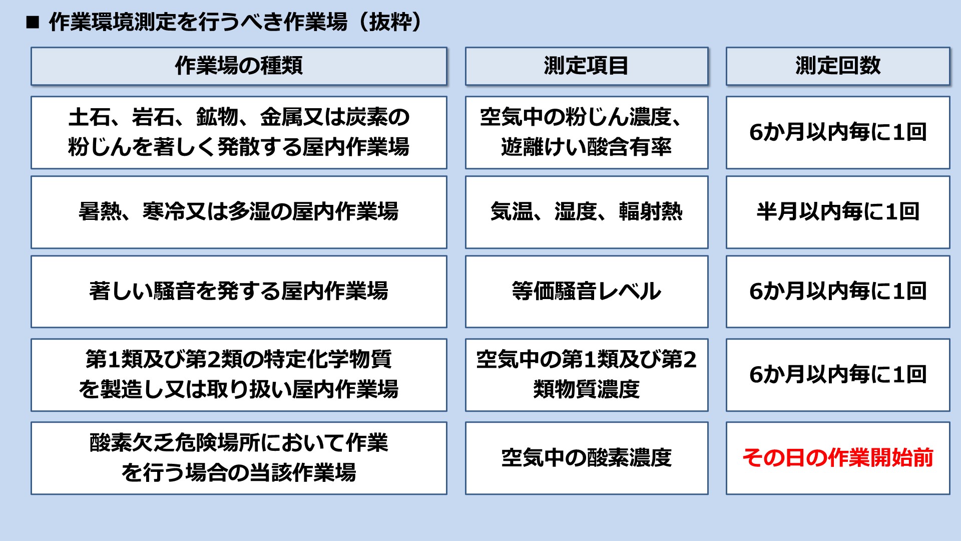 作業環境測定とは、作業環境中に有害な因子がどの程度存在し、そこで働く労働者がこれらの有害な因子にどの程度さらされているかを把握するためのもの。