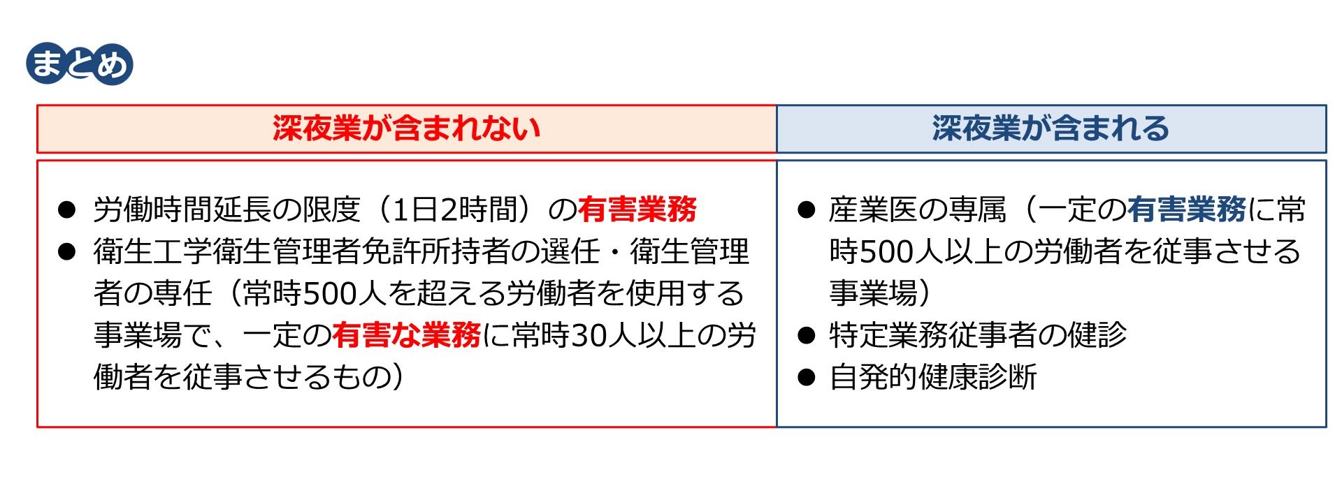なお、「深夜業が含まれない」のは、衛生管理者の専任の規定など。