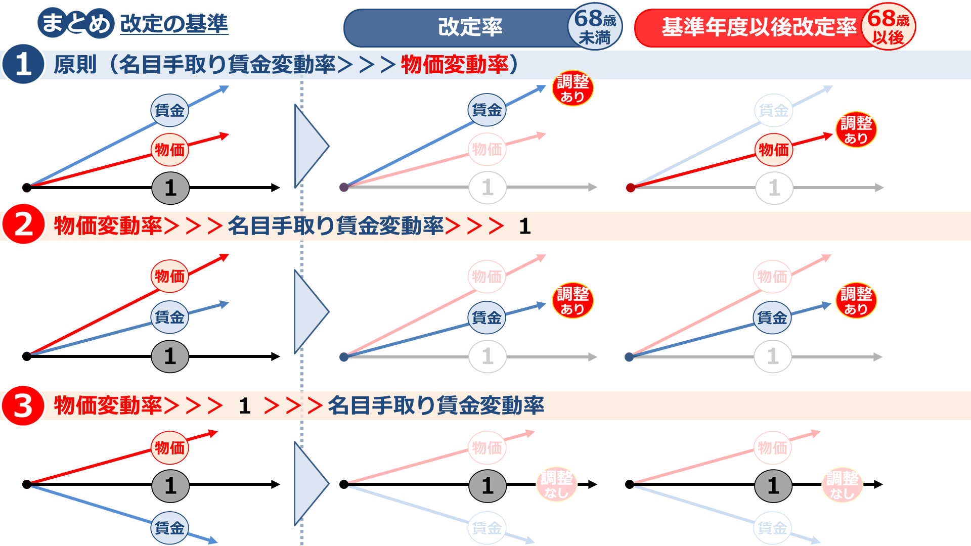 一方で、「物価>>賃金」となる逆転減少が生じる場合には、「3本線の真ん中」が改定の基準になります。
