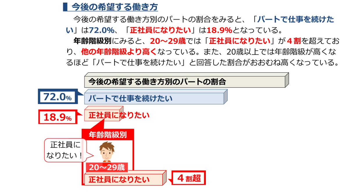 多くの場合、「時間の融通が効くから」という理由でパートという雇用形態を積極的に選択しているため、今後希望する働き方でもパートで仕事を続けたいという方が多くなっています。