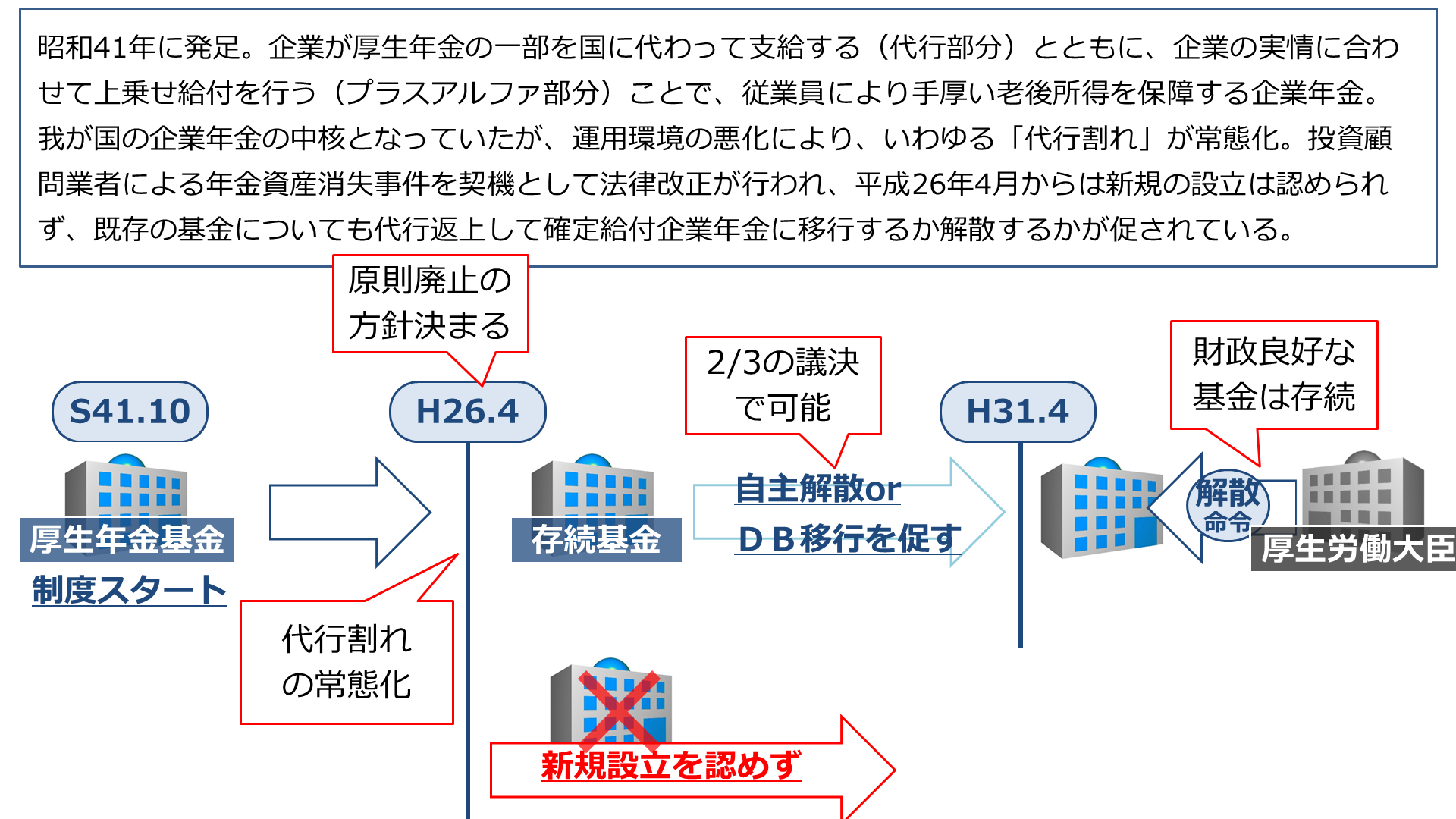 その後、社会経済情勢の変動により、制度のメリットが薄れ、平成26年4月からは新規の設立は認められず、既存の基金については他の制度に移行するか解散するかが促されている。