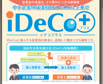 「iDeCo+」とは、企業年金を実施していない中小企業(従業員数100人以下)において、iDeCoに加入している従業員の加入者掛金に対して、事業主が掛金を上乗せ(追加)して拠出することができる制度。