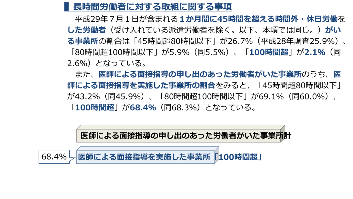 平成29年「労働安全衛生調査(実態調査)」によると、平成29年7月1日が含まれる1か月間に100時間超の時間外・休日労働をし、医師による面接指導の申し出があった労働者がいる事業所のうち、面接指導を実施した事業所の割合は約【?】%となっている。